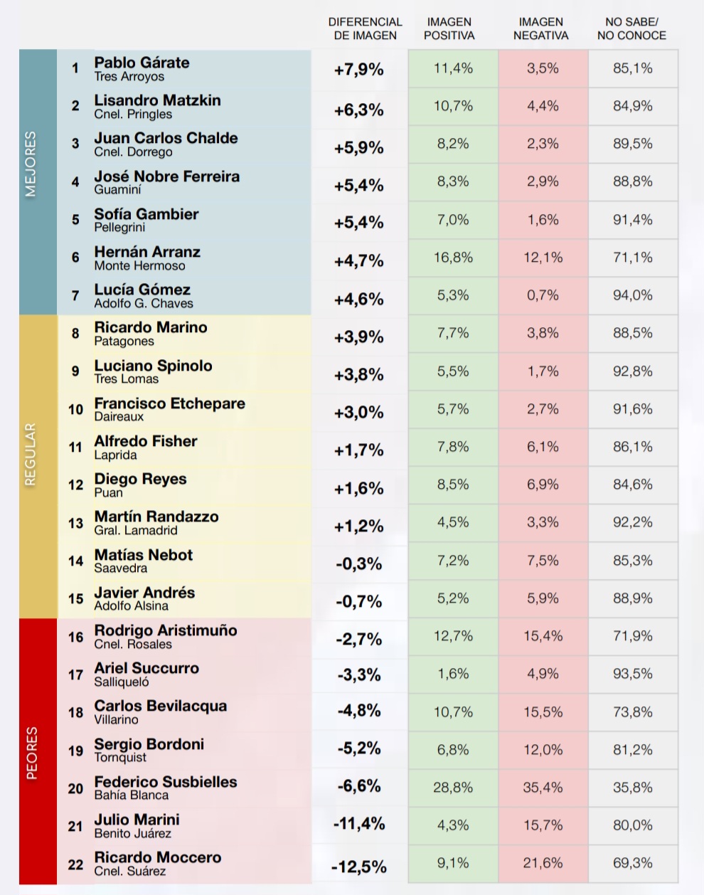 En último lugar aparece Ricardo Moccero (Coronel Suárez), con un diferencial de -12,5 puntos porcentuales; seguido por Julio Marini (Benito Juárez), con -11,4 puntos; y Federico Susbielles (Bahía Blanca), con -6,6 puntos.