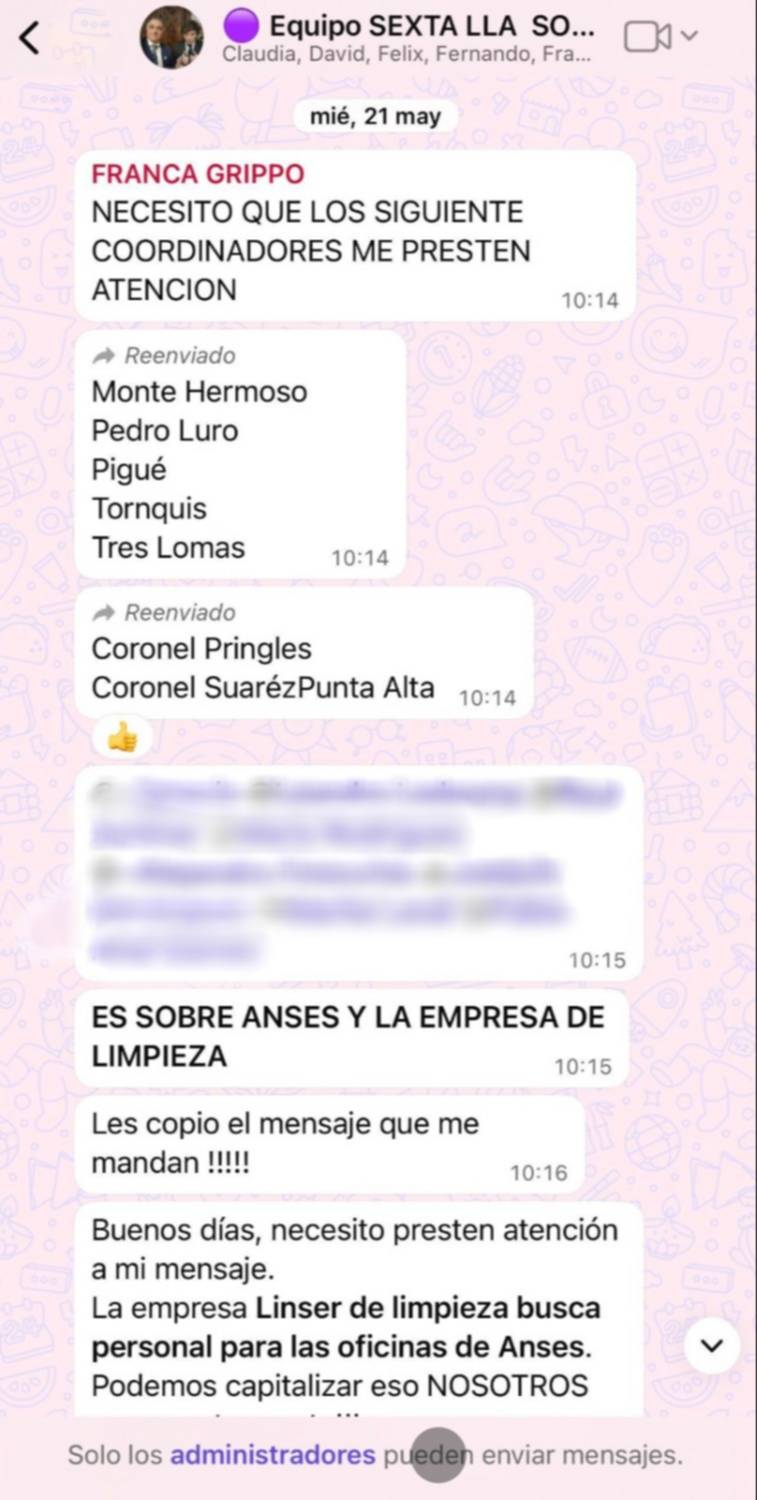 La presentación judicial fue impulsada por la coordinadora del Área de Discapacidad local, Andrea Elgart, junto al secretario de Desarrollo Social, Martín Garate. Según señalaron, los mensajes atribuidos a la concejala bahiense Franca Grippo darían cuenta de la posesión y eventual distribución del padrón de Incluir Salud —información protegida por ley— dividido por localidades para realizar tareas territoriales durante la campaña de 2025.