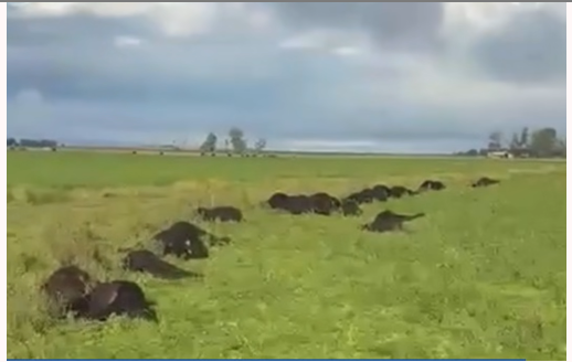 Las imágenes registradas por un productor rural de la zona evidencian la magnitud del episodio, con numerosos animales tendidos sobre el suelo tras el fenómeno, generando un fuerte impacto tanto económico como emocional en el ámbito agropecuario local.